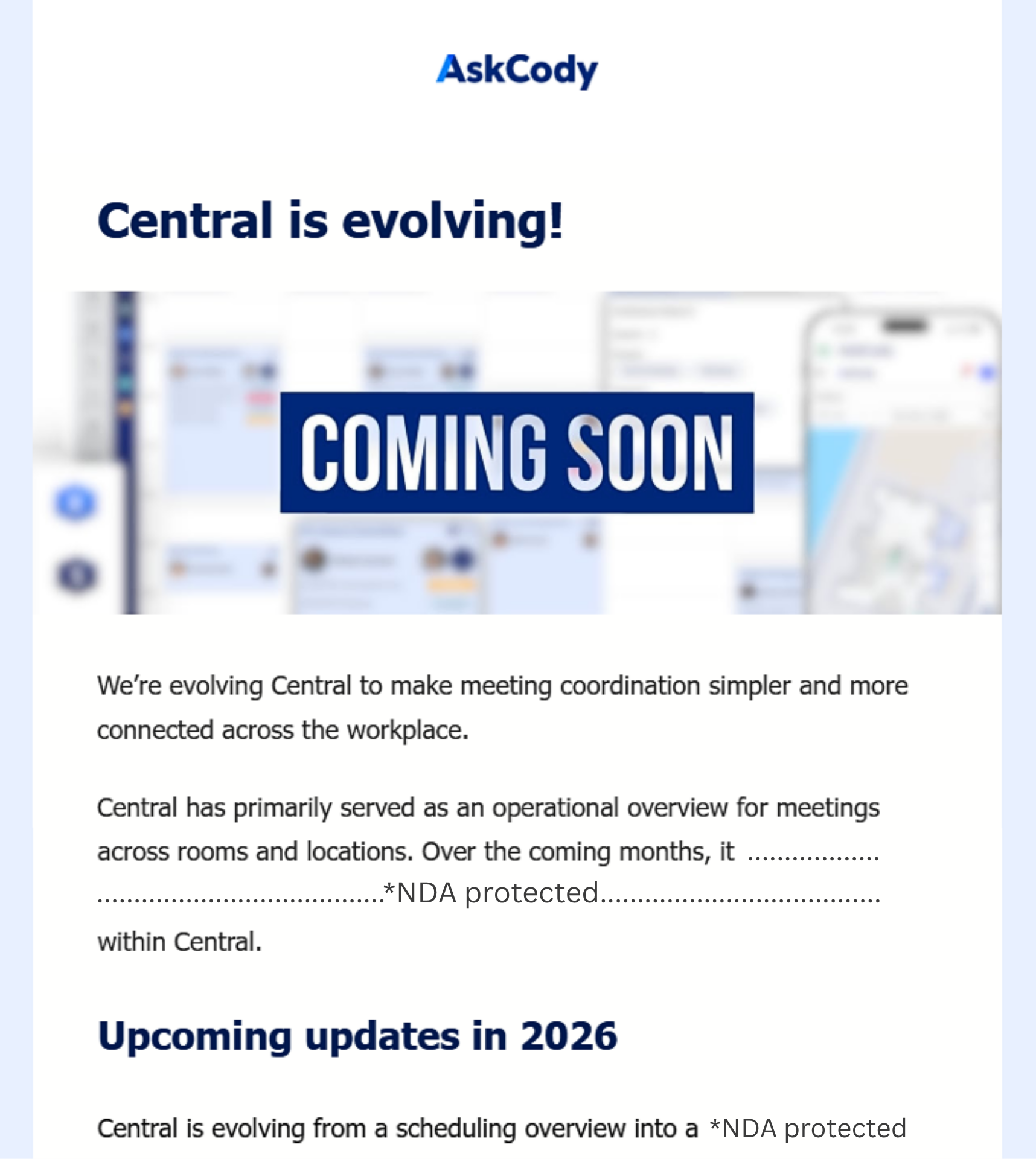 To create relevant messaging, I first conducted research into AskCody’s products, customer workflows, and the broader workplace management ecosystem. Understanding the customer journey was essential to identify user pain points and clearly communicate the value of the platform updates.
