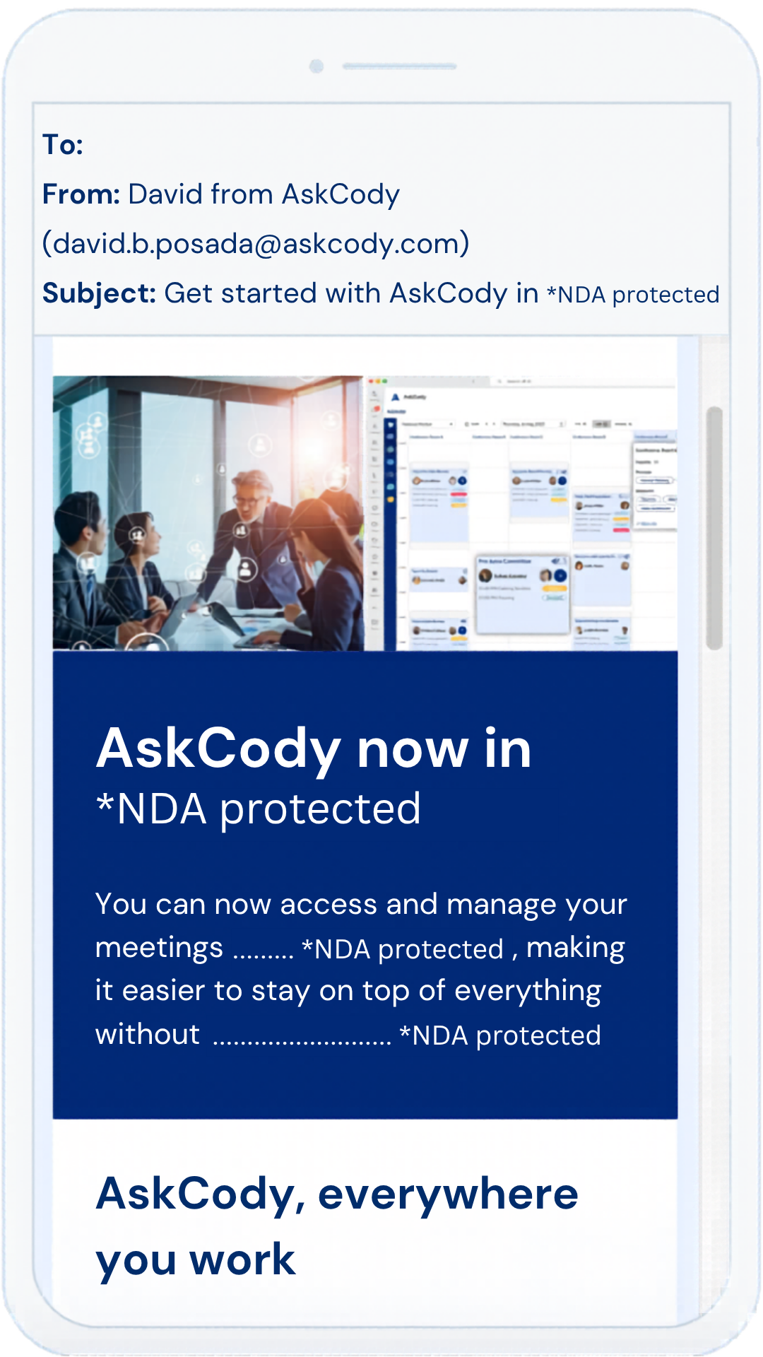 AskCody is a SaaS company that provides a platform for managing meetings, workspaces, services, and visitors in the workplace.