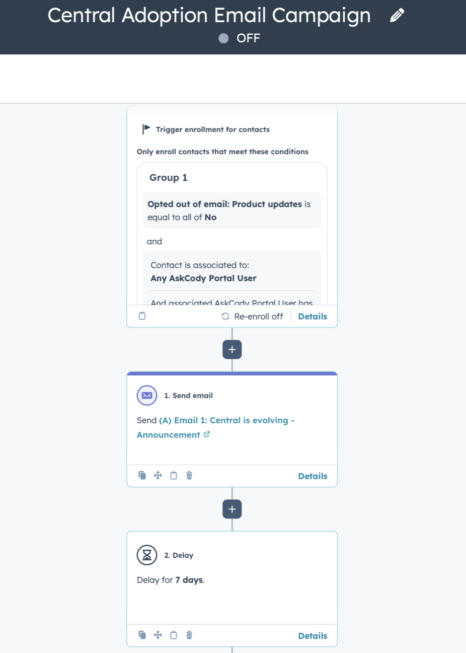 The main project I worked on was the Central Adoption Email Campaign, which aimed to help existing customers understand and start using the updated version of Central. Begining of the email flow is shown on the image (left).